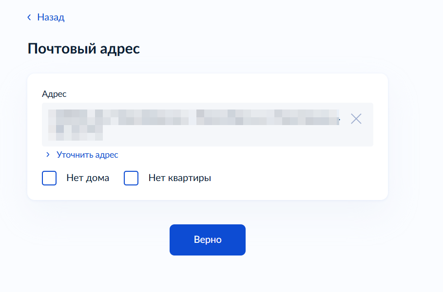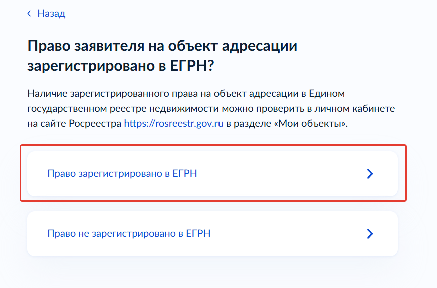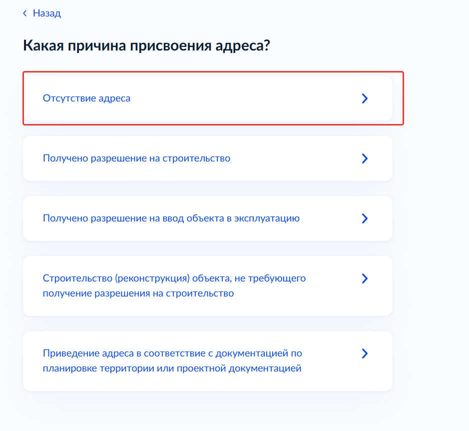 12. Если на 9 шаге выбрали 1 объект, сразу перекинет к п. 14 инструкции. Если на шаге 9 выбрали 2 объекта, то появится ещё один запрос причины изменения адреса, тут уже выбираем "Отсутствие адреса".