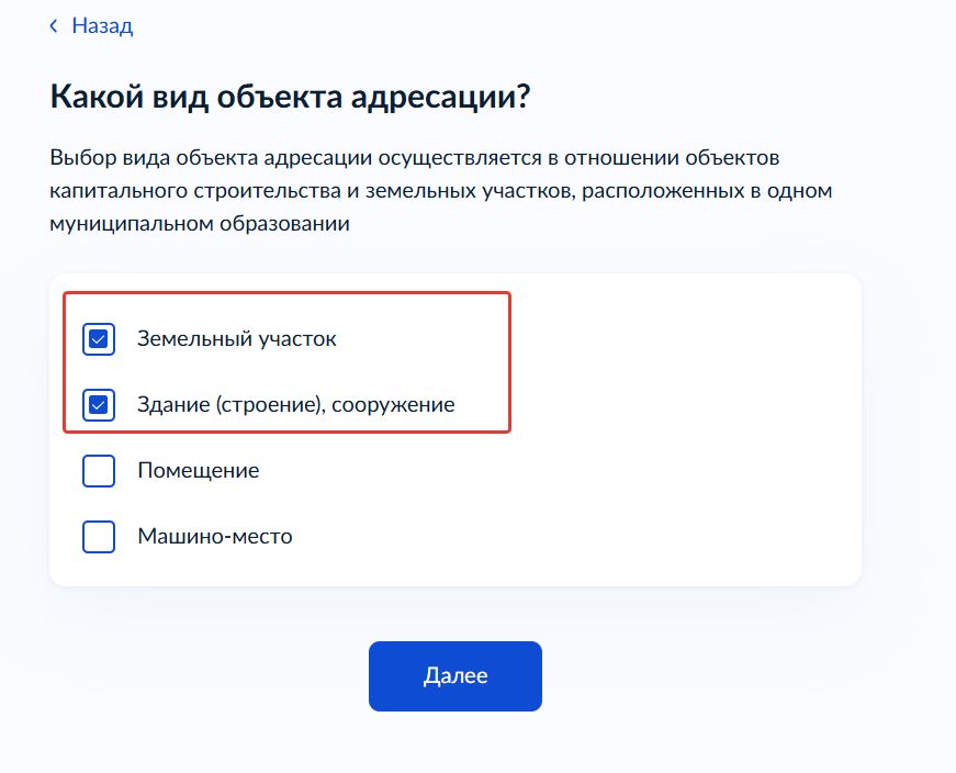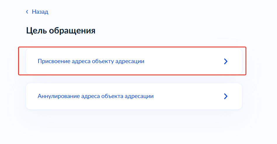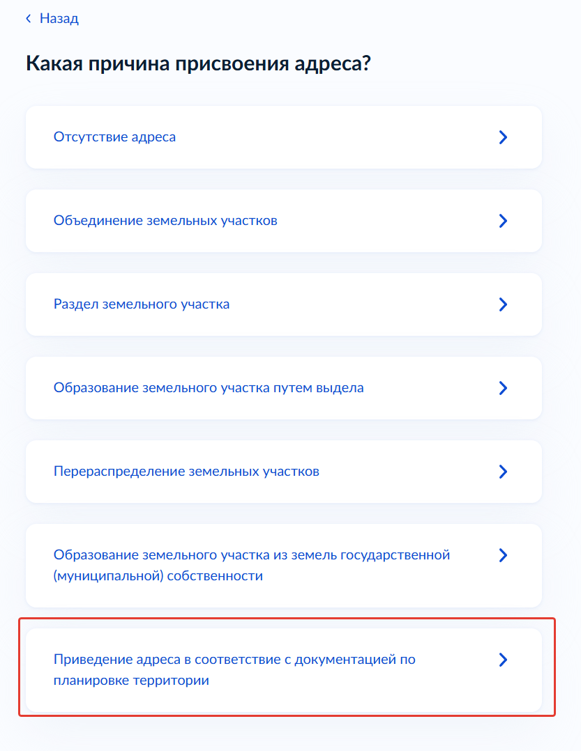 10. Далее идет выбор причины изменения адреса, первым идет для земельного участка, здесь выбираем то, что обведено