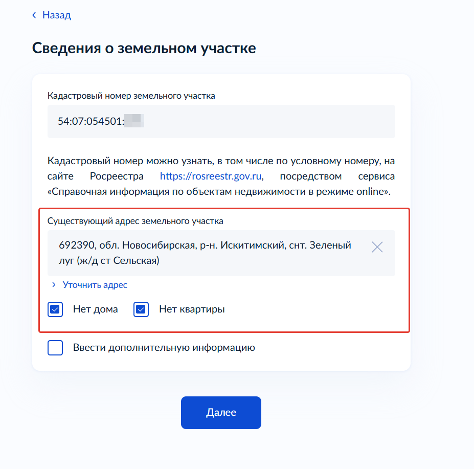 11. Далее указываем данные участка. Кадастровый номер свой указываете, адрес можно вот так как на скриншоте